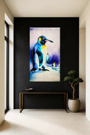 Step into the serene beauty of the Antarctic with Majestic Frost, a captivating silk painting by Zahra. This exquisite artwork brings to life the regal presence of the emperor penguin, standing tall against a dreamy, ice-kissed backdrop. The rich hues of deep blue, golden yellow, and soft lavender blend seamlessly, capturing the penguin’s natural grace and resilience.