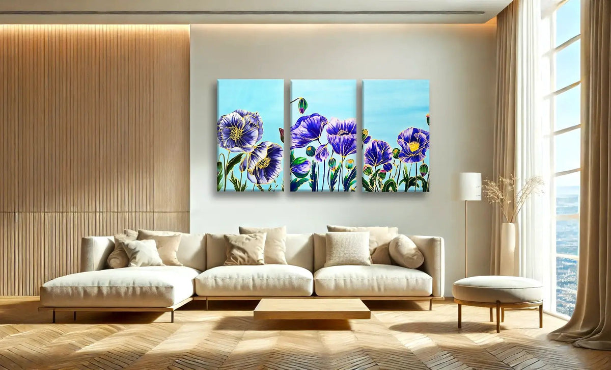 Sky-Kissed Poppies is a tranquil triptych silk painting featuring delicate purple poppy flowers set against a soft, sky-blue backdrop. Each panel is meticulously hand-painted on premium silk, capturing the subtle gradations of color, graceful petal shapes, and a gentle interplay of light. Displayed together, the three panels create a harmonious scene that brings an air of natural serenity and refined elegance to any setting.