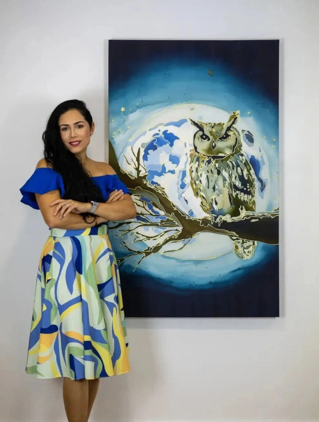Tailored Sizes & Formats Zahra ensures your artwork fits seamlessly into your space, offering a range of sizes and aspect ratios. Whether it's a singular statement piece or a curated set, the result is uniquely yours. Personalised Presentation: Zahra introduces your completed piece in a virtual unveiling session, walking you through the details and thought processes behind the design.
