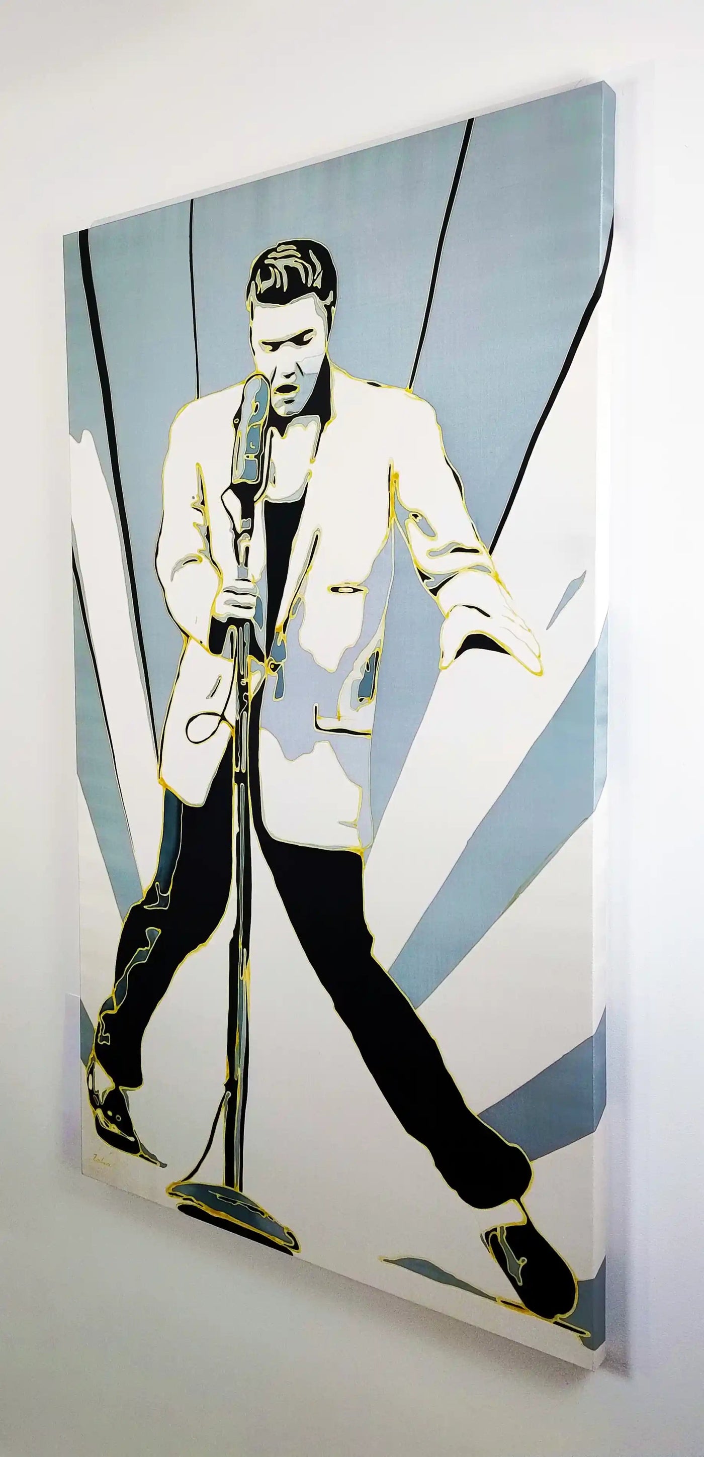 Perfect for hanging in a large living room, a music studio, or even a modern gallery space, this piece demands attention and admiration. Its bold size and intricate detailing make it an ideal centrepiece, drawing viewers into its magnetic aura. Whether you're an Elvis fan, a collector of fine art, or someone seeking a conversation-starting masterpiece, this painting brings a touch of nostalgia, glamour, and sophistication to any interior. Zahra’s artistry breathes new life into Elvis's image, presenting a unique tribute that transcends traditional portraits.