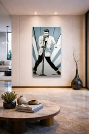 This striking silk painting of Elvis Presley, measuring a grand 61" x 35.4", captures the essence of the King of Rock 'n' Roll in his prime. With his iconic pose and commanding presence, Elvis is immortalized here in a monochrome palette infused with golden accents, symbolising his unparalleled legacy in music and pop culture. The delicate silk medium enhances the luminous quality of the artwork, with Zahra’s exquisite craftsmanship evident in every line and contour. The dynamic composition and radiating backdrop convey the energy and charisma that made Elvis the phenomenon he was.