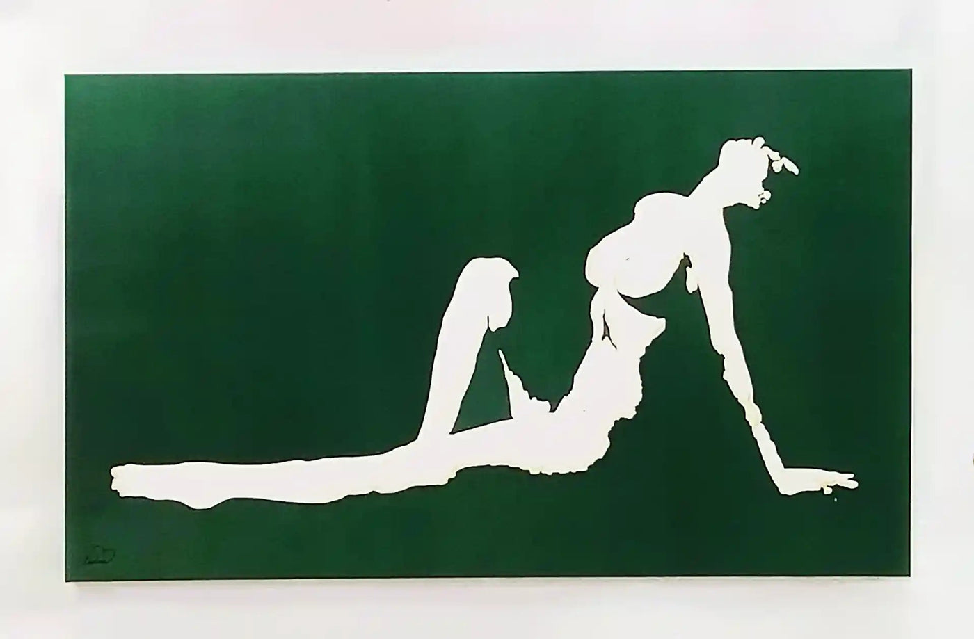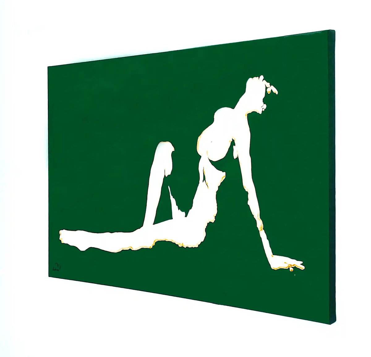 Emerald Poise is a striking silk painting by Zahra, capturing the elegant silhouette of a reclining woman, gracefully outlined against a deep green backdrop. Hand-painted using Zahra's signature golden wax technique, the figure exudes confidence and serenity, celebrating the beauty of the female form with a minimal yet powerful composition. The emerald green silk background evokes feelings of calm and depth, while the shimmering golden lines add a luxurious touch, drawing the eye to the fluid curves and poised posture.