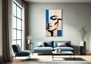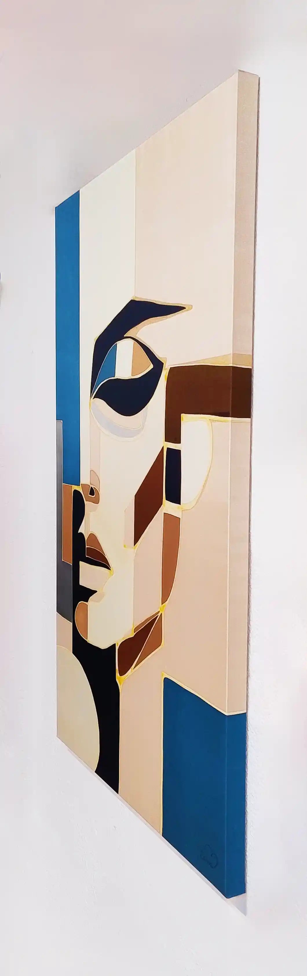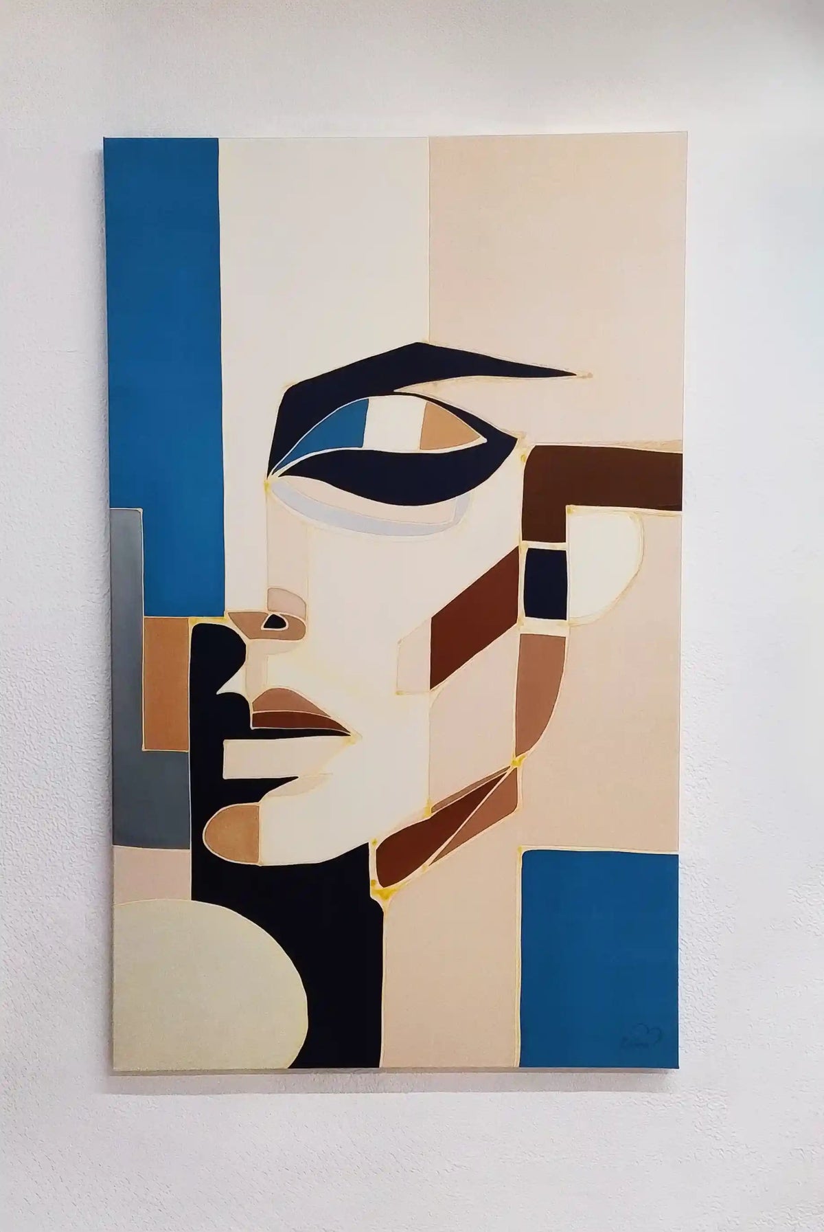 Fragments of Grace is a sophisticated cubist portrait, hand-painted by Zahra on pure silk using her signature golden wax technique. Geometric shapes interlock to form a serene, expressive face, where deep blues, warm neutrals, and soft ivory tones are gently outlined in radiant gold. Each segment captures a moment of emotion, creating a harmonious balance between strength, elegance, and quiet introspection.