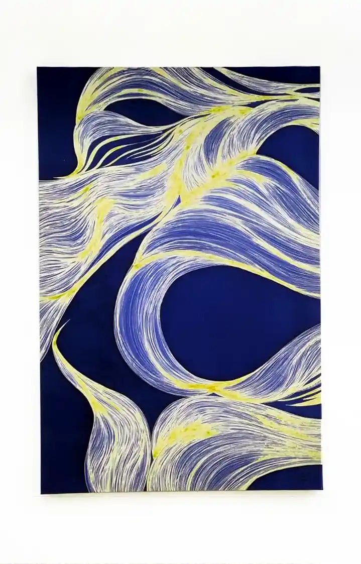 Golden Tides is an elegant, hand-painted silk artwork by Zahra, where fluid motion and refined luxury come together in perfect harmony. Inspired by the gentle rhythm of ocean currents, this piece features sweeping, intricate lines that glide effortlessly across a deep, rich backdrop, creating a sense of movement that feels both powerful and serene.