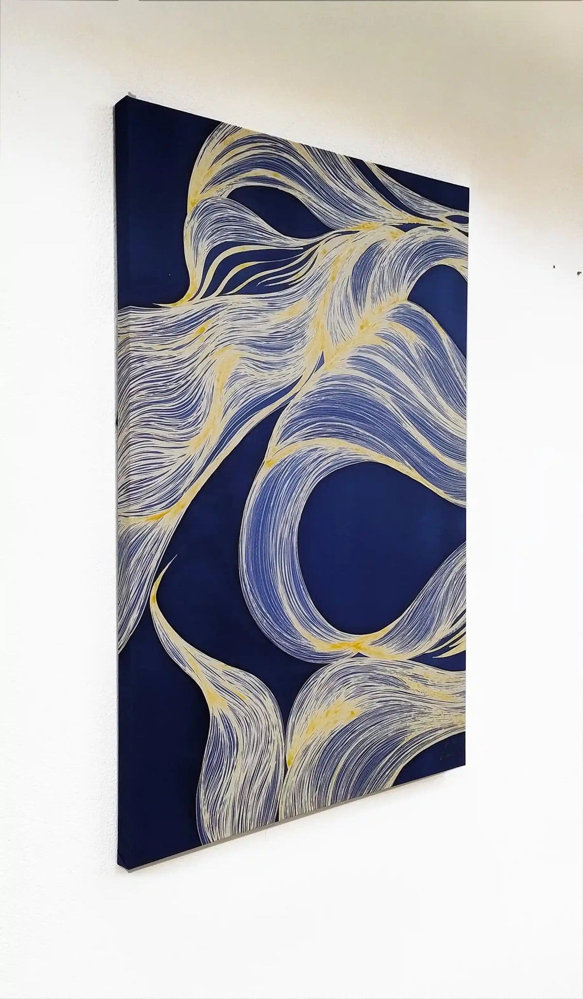 Measuring 80 × 130 cm, Golden Tides is designed to make a striking statement while maintaining an air of calm sophistication. It works beautifully in living rooms, above a console or sofa, in a refined bedroom setting, or within a curated office space—bringing a sense of flow, balance, and elevated elegance to any interior.
