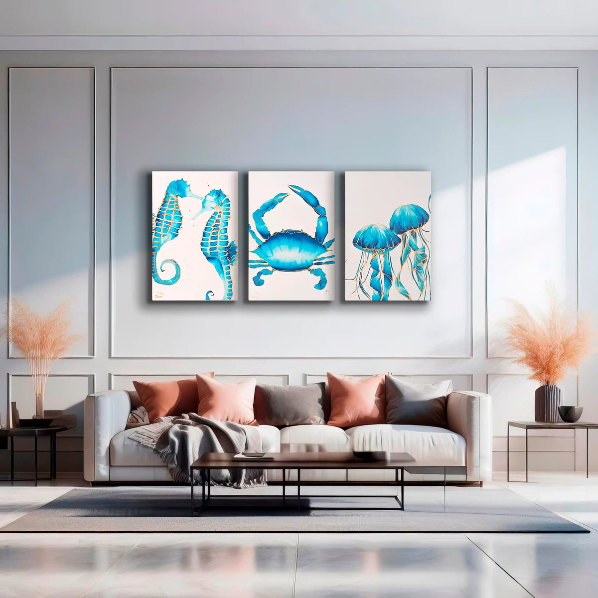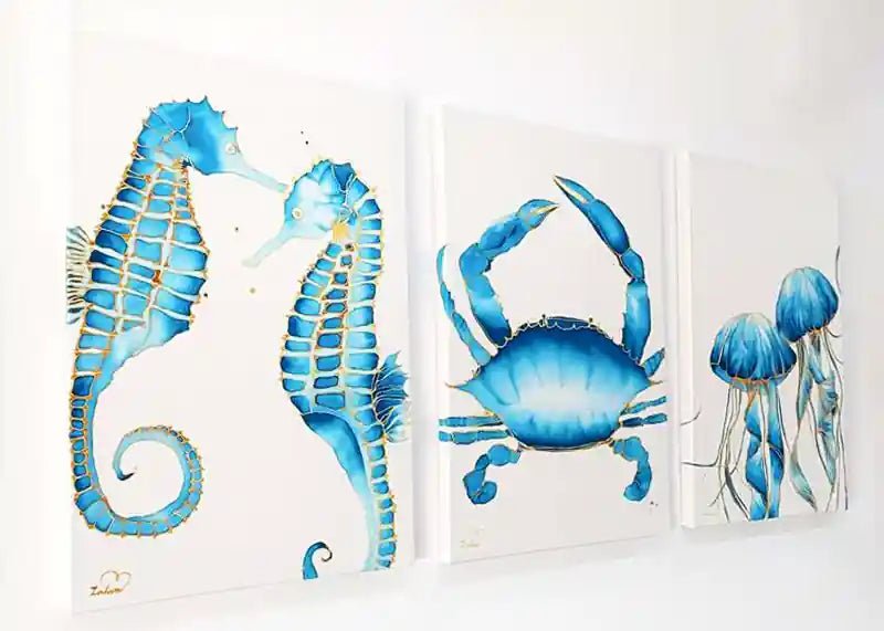 Marine Life Silk Art - Marine Marvels - Introducing a stunning set of three silk paintings, each measuring 90cm x 60cm, all brought to life by the talented artista Zahra. This exquisite collection transports you to the enchanting world of the ocean, elegantly portrayed on pristine white backgrounds. Delve into the serene depths of the ocean as you explore the graceful dance of seahorses, the intricate charm of a crab, and the ethereal beauty of jellyfish, all rendered in varying shades of blue.