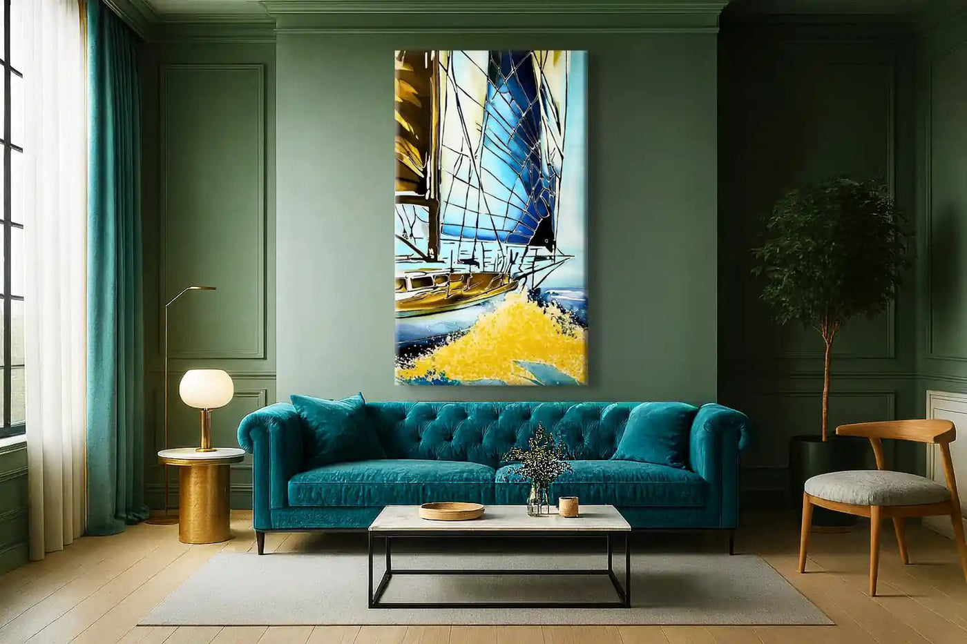 The deep blues of the sky and sea contrast beautifully with the golden hues of the yacht and the sparkling spray of water, creating a sense of movement and exhilaration. Zahra’s signature golden wax technique enhances the fine details of the rigging and reflections, adding a luminous quality that shifts with the light, making this piece come alive in any setting.